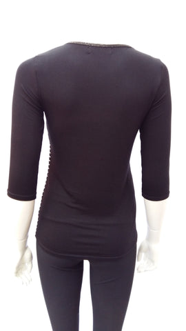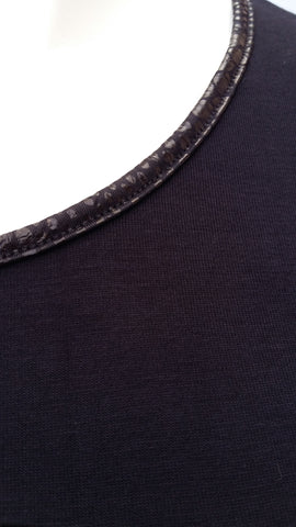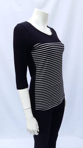 Polera cuello redondo, delantero rayado en blanco y negro, ribete ecocuero en cuello. Espalda, manga y cansú en negro.