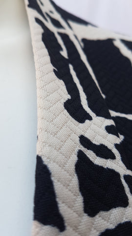 Blazer de tope con broches. Corte princesa, sin cuello (escote V), con tela Sofía en colores negro y beige. Manga larga, sin bolsillo.