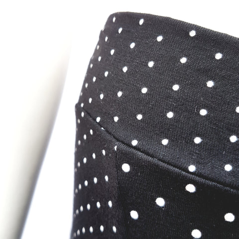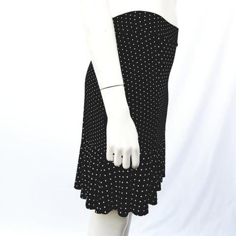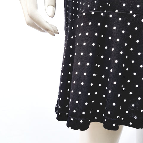 Falda con vuelo en ruedo, cortes en delantero y espalda. Con pretina eslasticada. Confeccionada en jersey con lunares chicos y medianos.