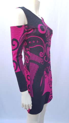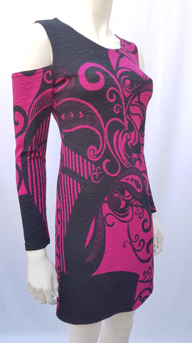 Vestido sin hombros (hombro descubierto), manga larga, semi-entallado. Confeccionado en tela Sofía con relieve en colores fucsia y negro con diseño de rayas y otros. Ocasión: oficina, coctail y otros.
