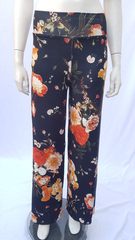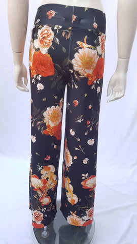 Pantalón Palazzo con pretina ancha. Confeccionado en tela Poliamida elasticada en color Negro con diseño de flores en tonos amarillo, naranjo, rojo y blanco.
