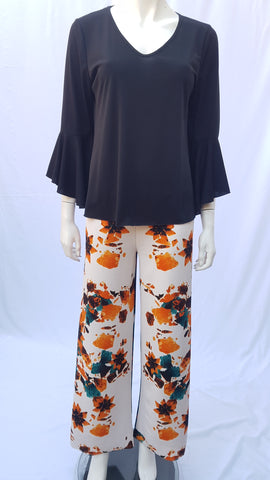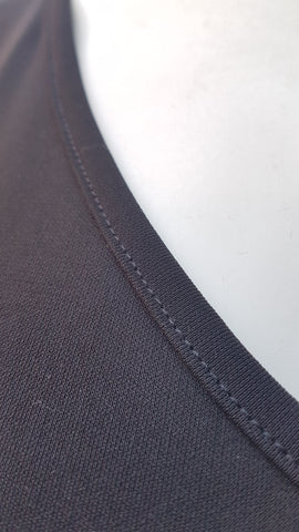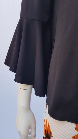 Polera escotada y drapeada en espalda, manga ¾ con terminación en vuelo. Cuello en escote V. Polera con corte semi evasé. Confeccionada en tela lycra en color negro.