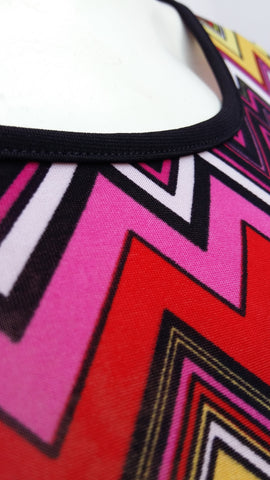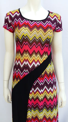 Vestido largo, manga corta, multicolor y aplicación negra en tela lycra. Cuello redondo.