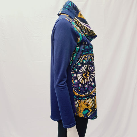 Polera color azul Francia, con cuello tortuga y manga larga. Espalda y mangas en tono azul. Delantero y cuello con diseño de mandalas en tonos calipso, amarillo, blanco invierno y azul.