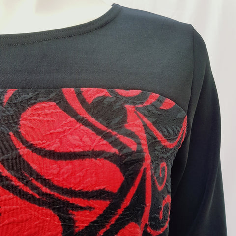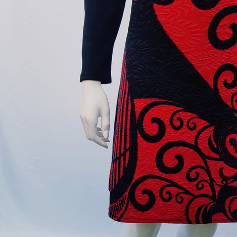 Vestido tipo jumper, confeccionado en 2 telas. Mini-ottoman negro en espalda canesú delantero, mangas y costadillo. En delantero tela Sofía en fondo rojo con detalles negros. Manga larga, cuello redondo. Largo sobre rodilla.