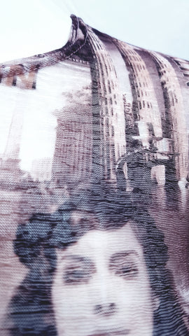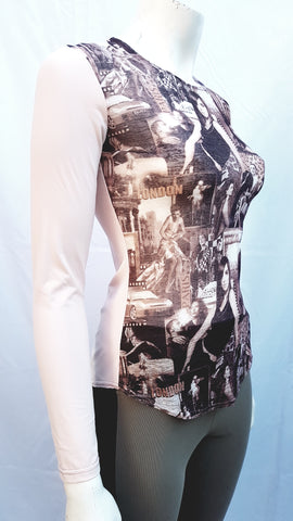 Polera elasticada, con cuello redondo y manga larga. Espalda y mangas en tono rosado tenue. Parte delantera con diseño de caras en tela gasa elasticada (en tonos café y rosa).
