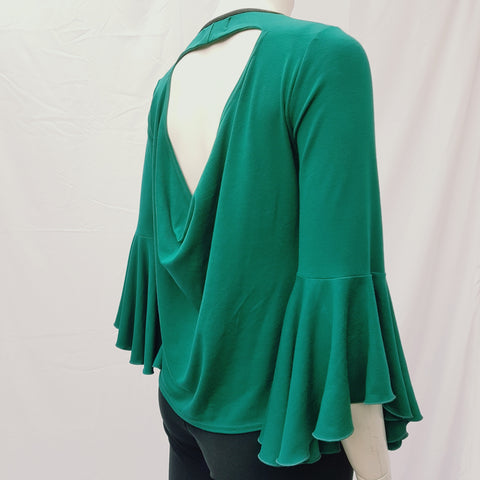 Polera verde escotada y drapeada en espalda. En delantero tiene escote V con ribete de ecocuero. Manga ¾ con terminación en vuelo campana.