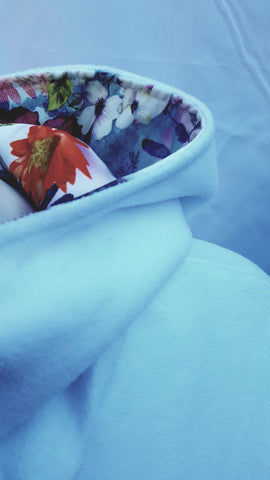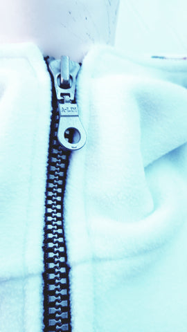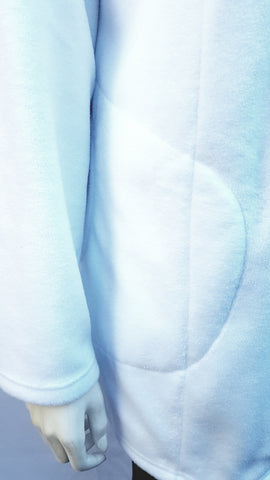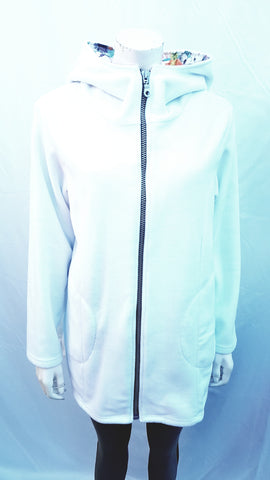 Abrigo de polar blanco, con forro floreado en gorro-capucha. Corte en delantero y espalda. Bolsillos con pespunte. Cierre grueso plateado.