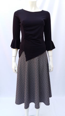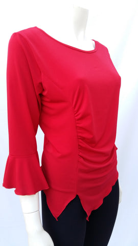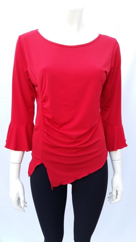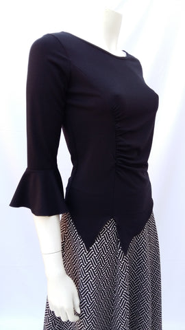 Polera drapeada en delantero, manga 3/4 terminada en campana. Escote bote.