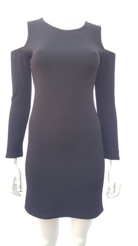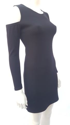 Vestido negro (otros colores: Rojo, Azul Francia, Azul Marino), sin hombro, manga larga, cuello redondo. Opciones de largo: Mini, sobre la rodilla, bajo la rodilla.