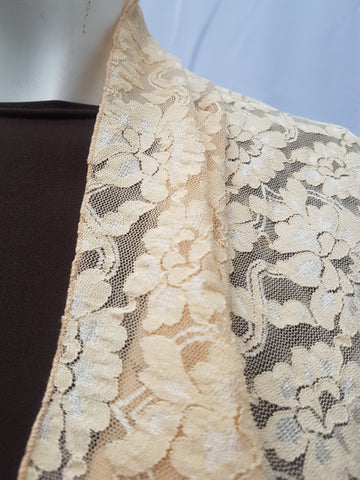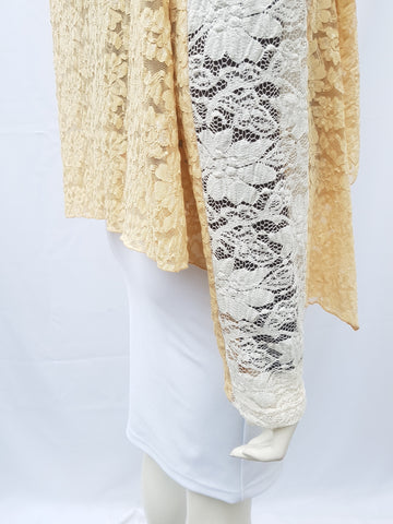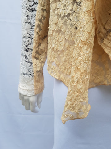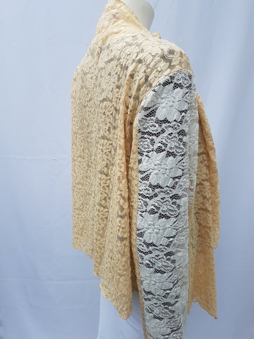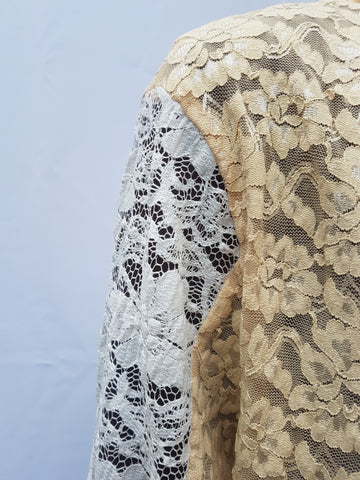 Tapado corto en encaje tonos vainilla y blanco (en manga). Manga larga.