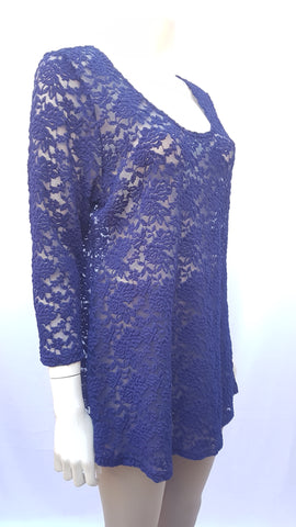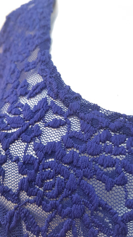 Polera larga de Mujer hecha en encaje elasticado color azul Francia. Semi evasé, manga tres cuartos y cuello redondo.