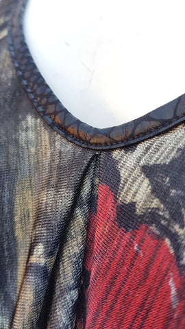 Polera con gran nudo en ruedo delantero, manga kimono y escote V con vivo en ecocuero (ribete). Espalda larga con terminación redonda.