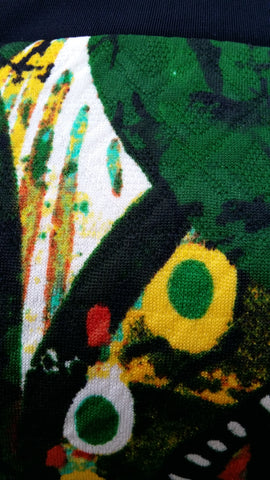 Mini vestido mujer Evasé. Manga larga. Canesú, costadillo y mangas en color negro con tela mini Ottoman. Delantero y espalda en tela Sofía con tonos verdes y amarillos.