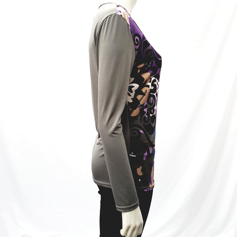 Polera con escote redondo amplio. Manga y espalda en tono gris. Delantero en tela floreada con tonos morados, blanco y gris. Manga larga.