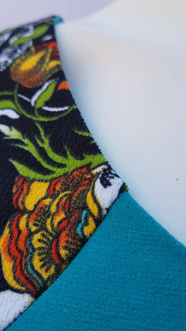 Vestido tipo jumper con manga larga y cuello escote V amplio. Parte delantera y espalda en color verde turquesa en tela punto roma. Costados y mangas en color negro con flores amarillas, confeccionada en tela Sofía.
